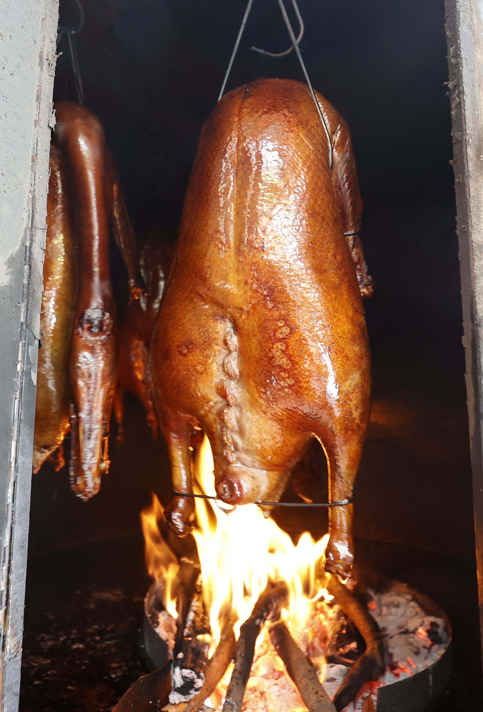 将烧鹅技艺做到极致,东莞人的努力远不止于此。当大岭山的匠人给美味烧鹅加上一抹荔枝香时,莞城的烧制师傅则采用炭火烧制出脆皮烧鹅,给大众更多味蕾新选择。莞城脆皮烧鹅“味香油润,醇厚酥脆,斩件烧鹅皮、肉、骨连而不脱,触齿分离”,同样深得周边街坊喜爱。