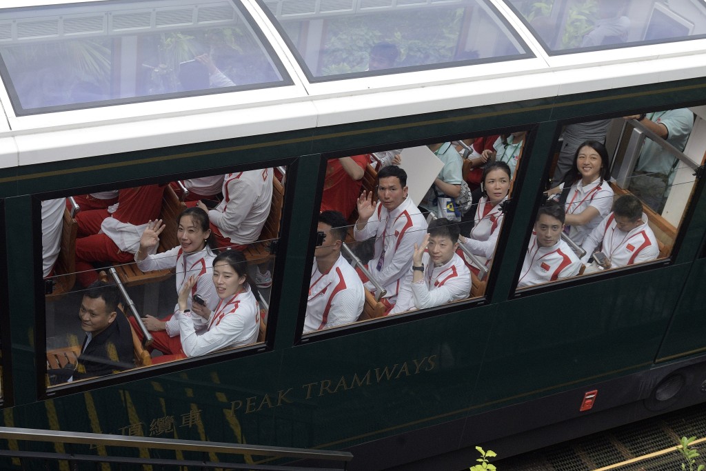 下午2时40分,国家队代表团乘坐缆车抵达山顶,引来市民欢呼声及举手机拍摄,有人高呼偶像名字,运动员不时转身向群众挥手道谢。