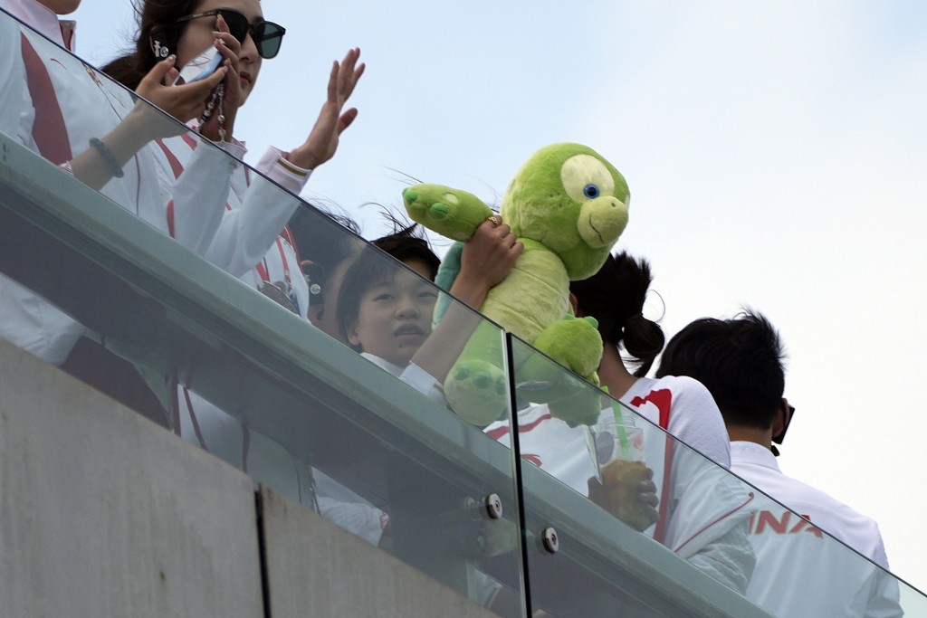 巴黎奥运国家队代表团下午到山顶游览,约200名市民在缆车站外等候,争睹偶像风采,有人携着“中国骄傲”的特刊及国旗以表支持,大批运装及便装警员在场维持秩序,警犬检查山顶缆车车厢确保安全,凌霄阁的地下及一楼商场位置如常营运,让市民自由进出。