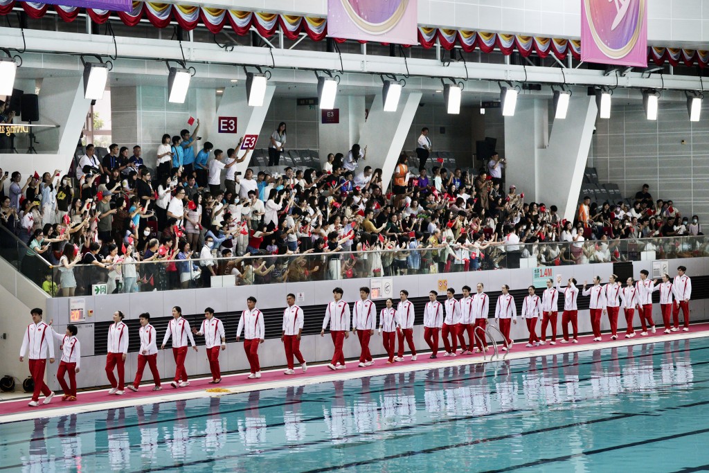 26位金牌运动员进场,潘展乐及全红婵站在头两位,运动员依次挥手向镜头打招呼,绕场一周,全红婵全程挥手回应粉丝,现场欢呼尖叫不断。