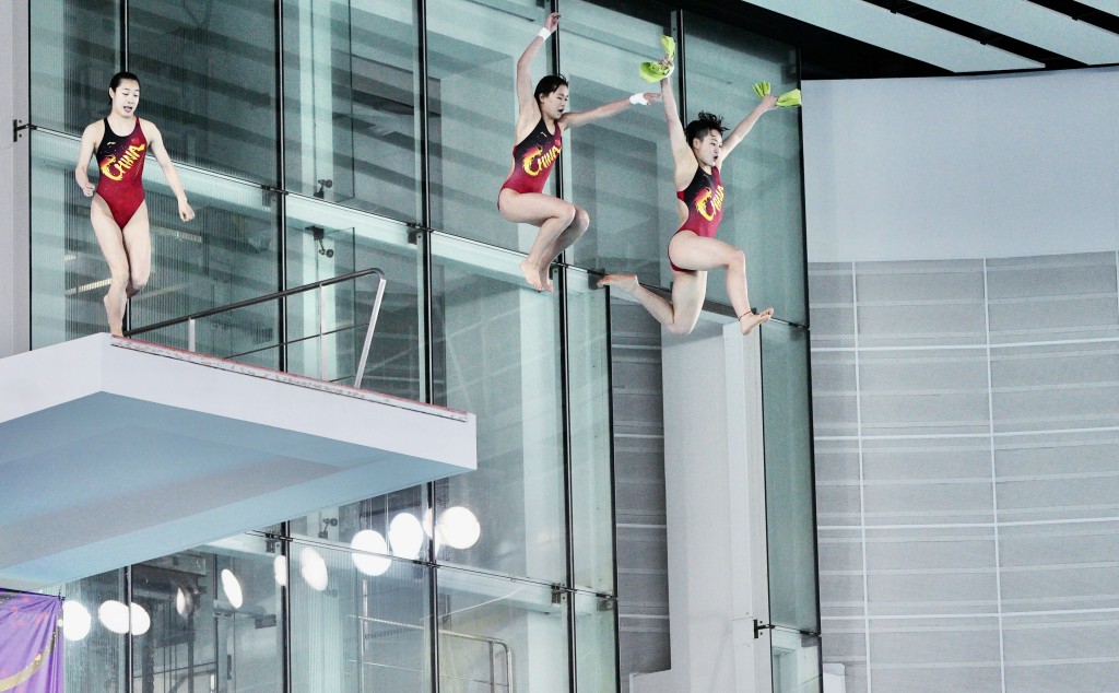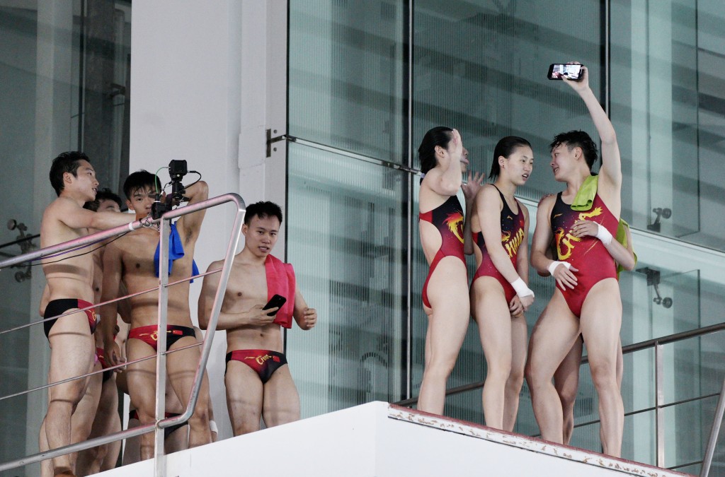 9时15分左右,运动员出场热身,全红婵手持绿色毛巾登场,热身阶段已为观众展示“水花消失术”,引起阵阵欢呼。运动员其后登上10米高台练习,全红婵持手机与队友自拍,昌雅妮、陈艺文及全红婵为大家展示10米高台“三人跳水”。