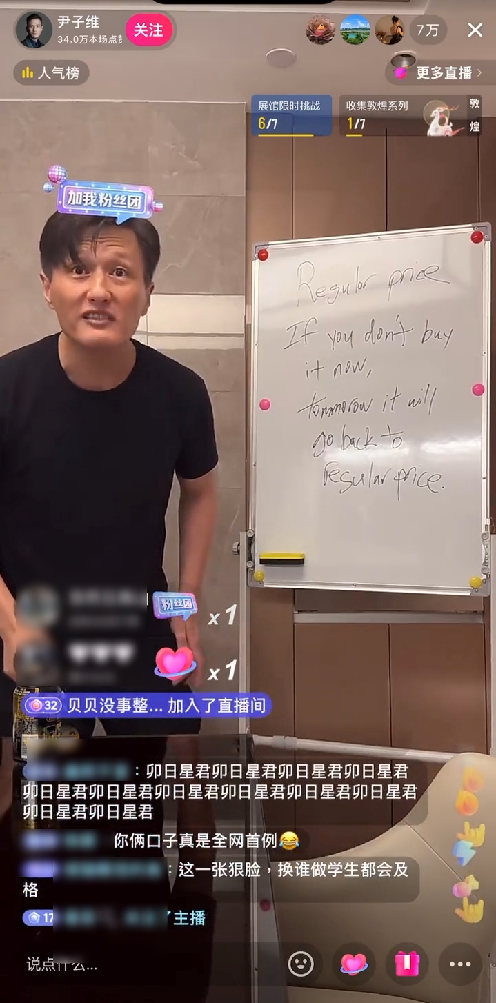 有网民日前在小红书以“要笑死在尹子维直播间”为题发帖,并写道:“求求了大家去看尹子维教徐冬冬学英文好吗? 真的太好笑了!” 影片可见,身穿黑tee的尹子维站在白板旁边,他对着徐冬冬怒气冲冲说:“不要看手机”,徐冬冬解释不是看手机,是看这个是写什么,尹子维闻言后继续发难,“你看我,不是我在跟你说吗?”