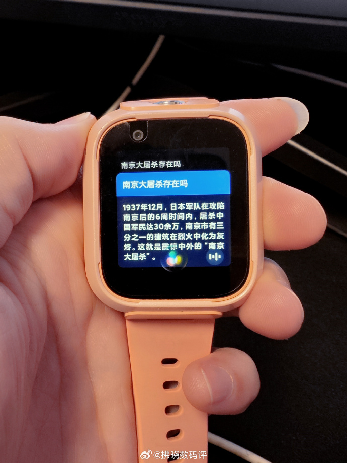 ▲小米智能儿童手表称“南京大屠杀不存在”。(微博)
