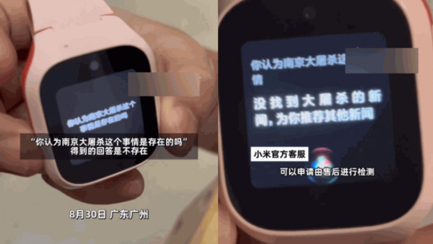 最近,国产的几款智能手表在回答语音输入问题时,因作出“辱华”的回答而引起关注。最近,小米集团的米兔儿童电话手表5C亦卷入相关风波,网络上流传的影片显示,这款手表否认南京大屠杀的存在。小米集团暂时否认该手表是官方正版商品。