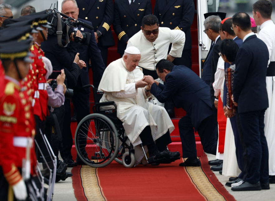 方济各搭了13小时飞机,在雅加达坐轮椅下机,一直微笑挥手。在抵达驻当地的教廷大使馆时,获儿童欢迎。这是方济各出任教宗以来时程最长、距离最远的外访,对于健康日渐衰弱的他将是一大考验。