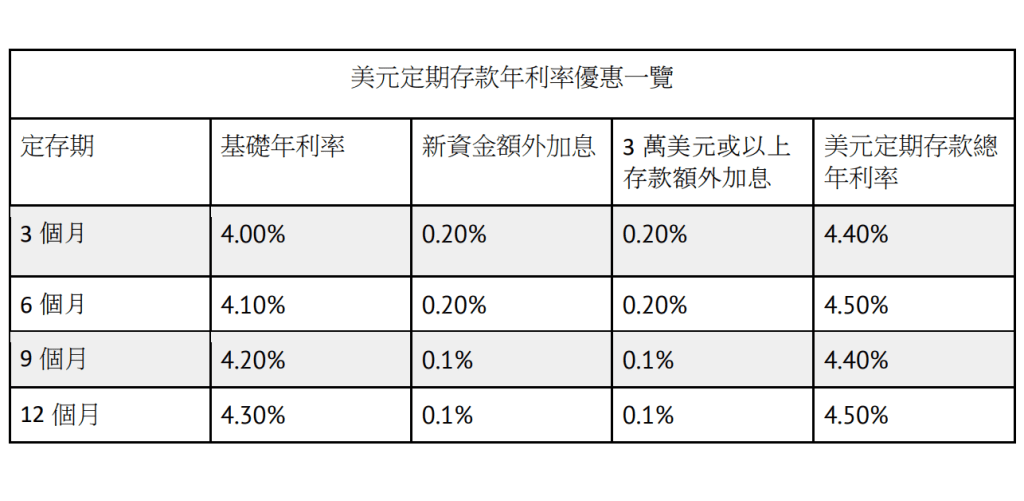 以回报最高的12个月美元定存计,基础利率为4.3厘,新资金及本金3万美元以上,将增至4.5厘;而6个月美元定存虽然基础年利率4.1厘,但新资金及本金3万美元门槛各之额外加0.2厘,合共亦是4.5厘。以3万美元叙造12个月定存,到期可获1,350美元利息。