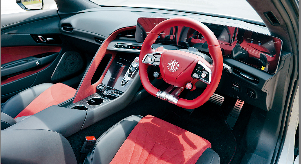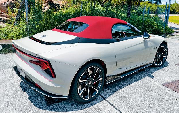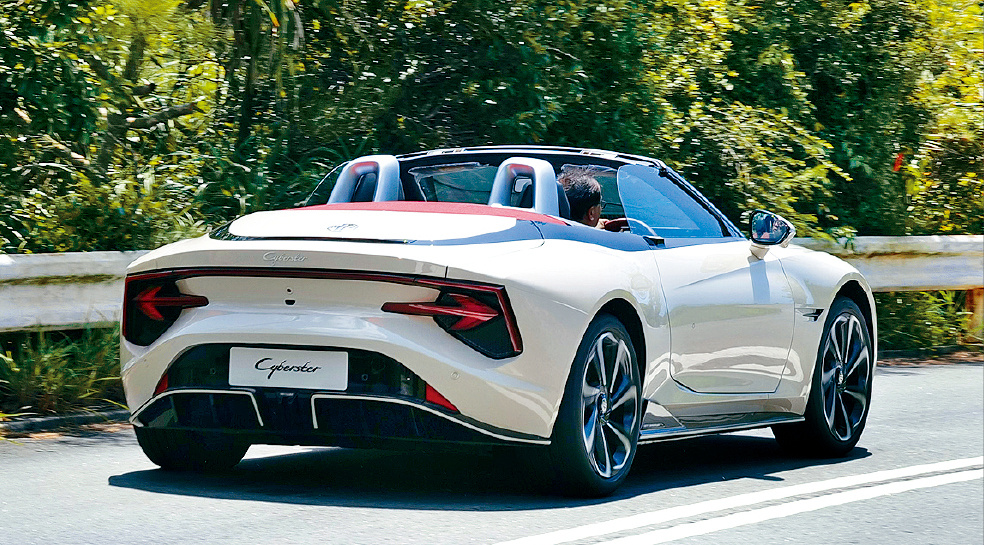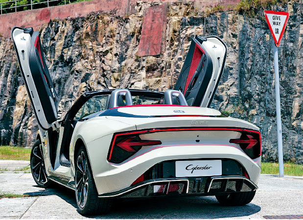 这款Cyberster 4WD我其实去年底在广东肇庆赛车场试过一次,不过厂方指出口版悬挂再经过改良,车厢OS作业系统也跟内地版不同。全车最具话题是电动开合鸥翼车门及电动软篷(开或关只需10秒,可在50km/h或以下操作)。原车配有20吋胎軨、Brembo煞车钳,车厢以Nappa皮革及Alcantara物料包装,表板面前有三组相连数码屏幕,中控台另设直立触屏,所有显示细致而且触控反应够快。标准配置Bose音响、360度镜头及主动安全系统等。虽然车子是在内地制造,不过研发及调校由英国Longbridge总部40位工程师团队负责,造工及扎实感跟欧洲车没分别。