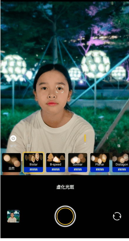 伴随蔡司镜头而来的,还有为人像拍摄而设的7种经典蔡司镜头风格,简单转换Biostar、B-speed、Sonnar、Planar、Distagon、Cine-flare及Cinematic风格,即可为背景加入不同的虚化光斑,以独特散景效果衬托主体。独有风格以外,V40 5G预设了23mm风景、35mm街头、50mm自然及50mm经典4种人像焦段,一按便可转换角度重新构图。