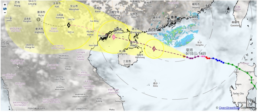 ▲香港天文台预测台风摩羯将在明早(6日)于香港西南300公里左右掠过。 (图片来源:香港天文台)