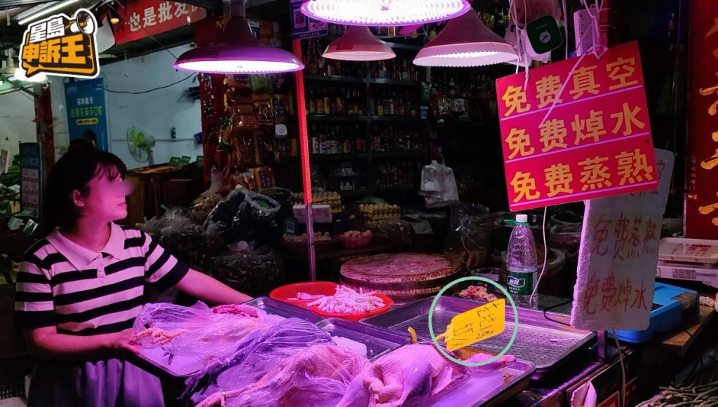 ▲街上专卖生肉的摊档都打正旗号,标明免费真空、免费灼水、免费蒸熟,相信是用来招揽港客。