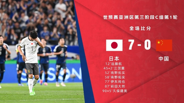 9月5日晚在日本举行世界杯预选赛,中国不敌日本,惨败0比7。此役创造了中国男足对阵日本历史最大比分失利、世预赛单场最多丢球以及世预赛最大比分失利。