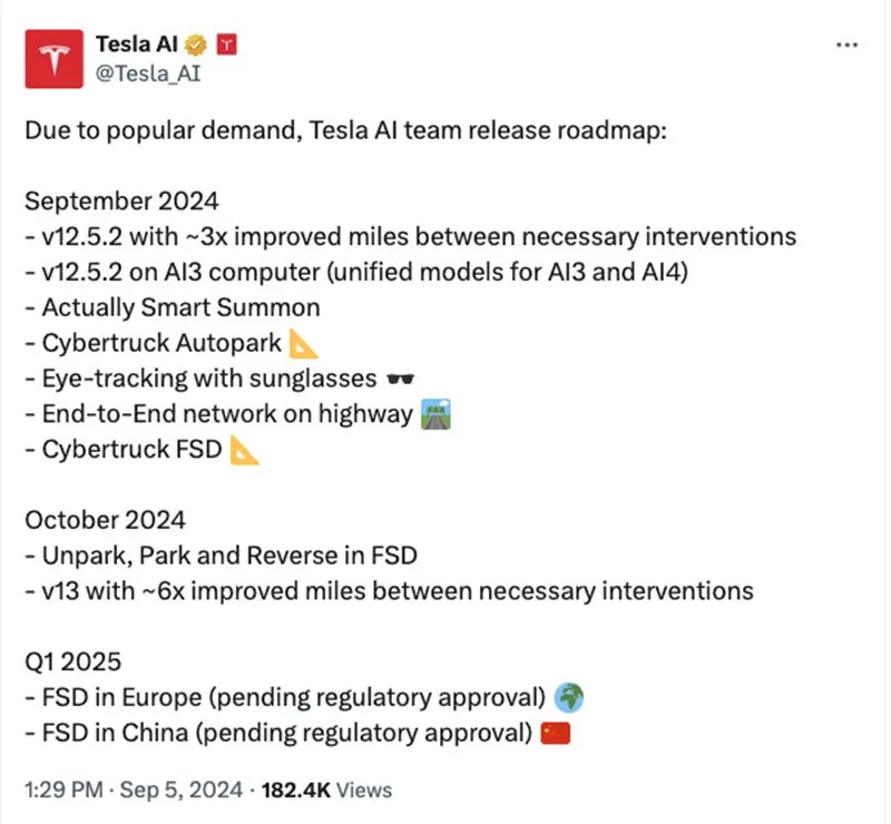 ▲Tesla官方账号昨日(5日)在社交媒体上发文称,计划明年第一季在中国和欧洲推出全自动驾驶功能(FSD)。