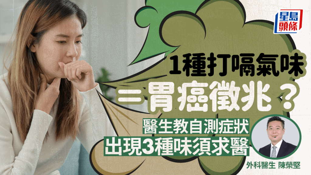 外科医生陈荣坚在其Facebook专页发文指,造成打嗝的原因有很多,可能是中枢神经异常放电、气体异常堆积、横隔膜受到刺激,甚至是癌症等因素有关。他提醒,如果打嗝时伴随以下3种难闻气味,有可能是身体发出警号。