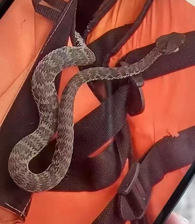 ▲一条紫斑红树林竹叶青藏在救生衣里。(微博)