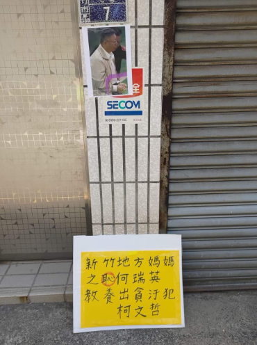 有网友在在社群平台Threads上发文,柯文哲的新竹老家门口,遭民众贴上柯文哲双手上铐的照片,地上还放着写了“新竹地方妈妈之耻何瑞英,教养出贪污犯柯文哲”的广告牌,让原PO直呼“挖,有点过了”。