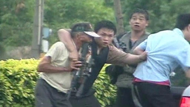 ▲“台湾张子强”张锡铭(左一)2004年与同伙被围捕时挟持1名老农(右一)和警察街头枪战。中时资料图