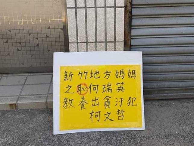 台湾民众党主席、前台北市长柯文哲涉京华城案遭羁押禁见,疑有民众将他遭上铐照片贴在位于新竹市的柯母家门口,甚至将写着“教养出贪污犯柯文哲”的纸板放在门外地上。