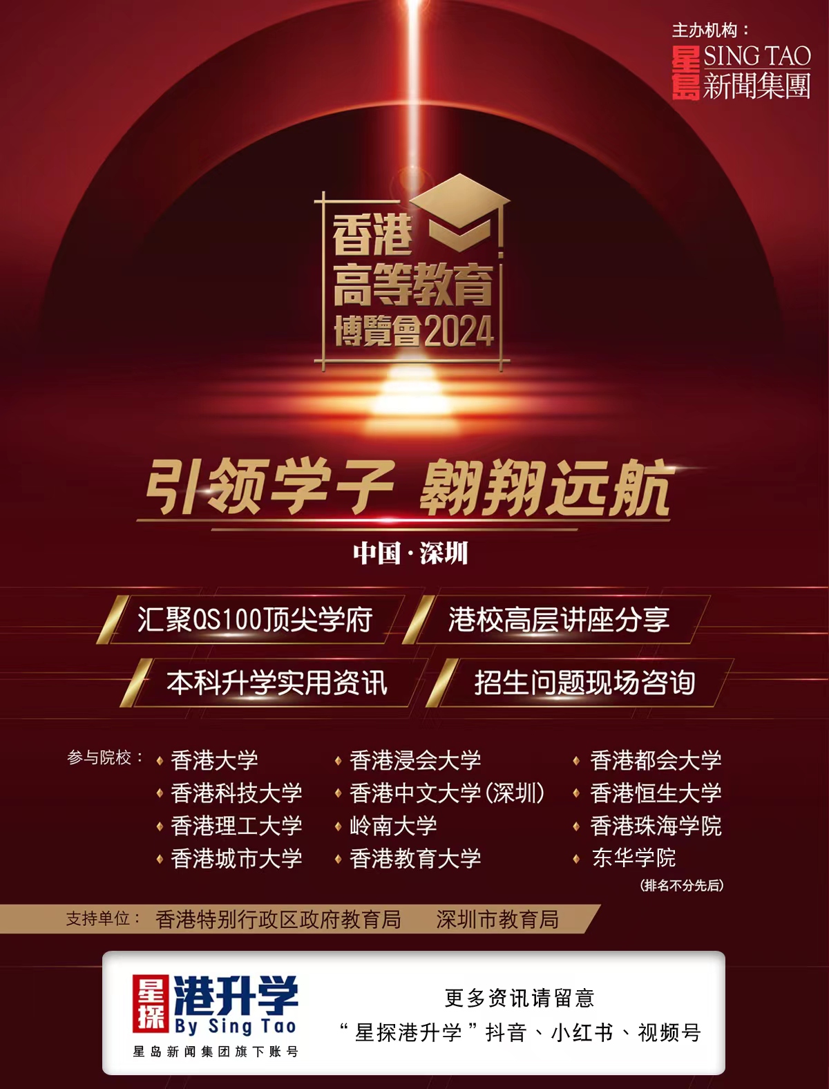 最权威的香港本科升学资讯!10月19日,星岛新闻集团携香港各大高校,在深圳举办香港高等教育博览会,推介优质香港高等教育资源。名额有限,请点击链接填写资料,及早获得参加机会。