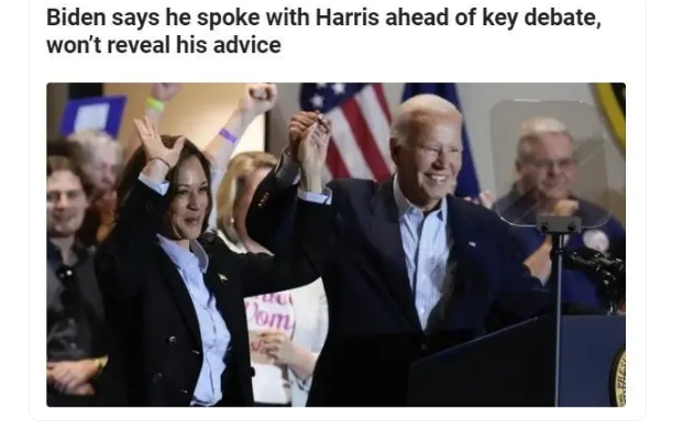 辩论前,美国总统拜登在白宫南草坪接受采访时表示,他已经与哈里斯进行了交谈。
