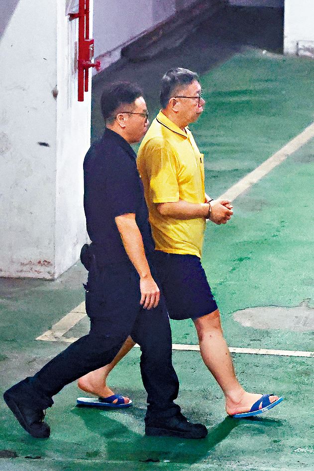 ▲柯文哲被扣押,身穿短裤,双手上铐。