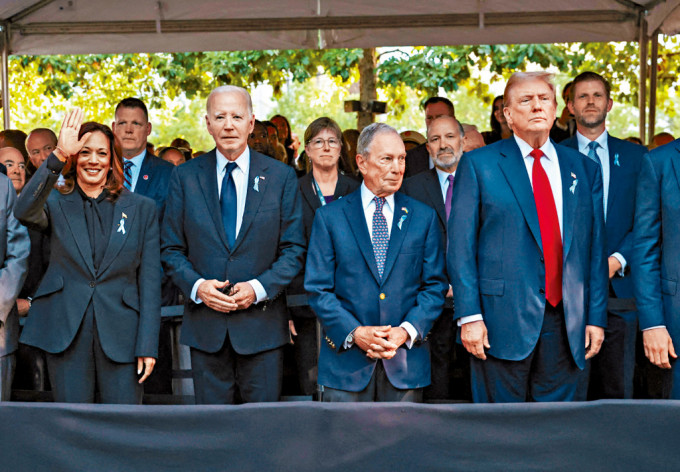 ▲(自左至右)哈里斯、拜登、前纽约市长彭博、特朗普,周三在纽约市出席911悼念仪式。