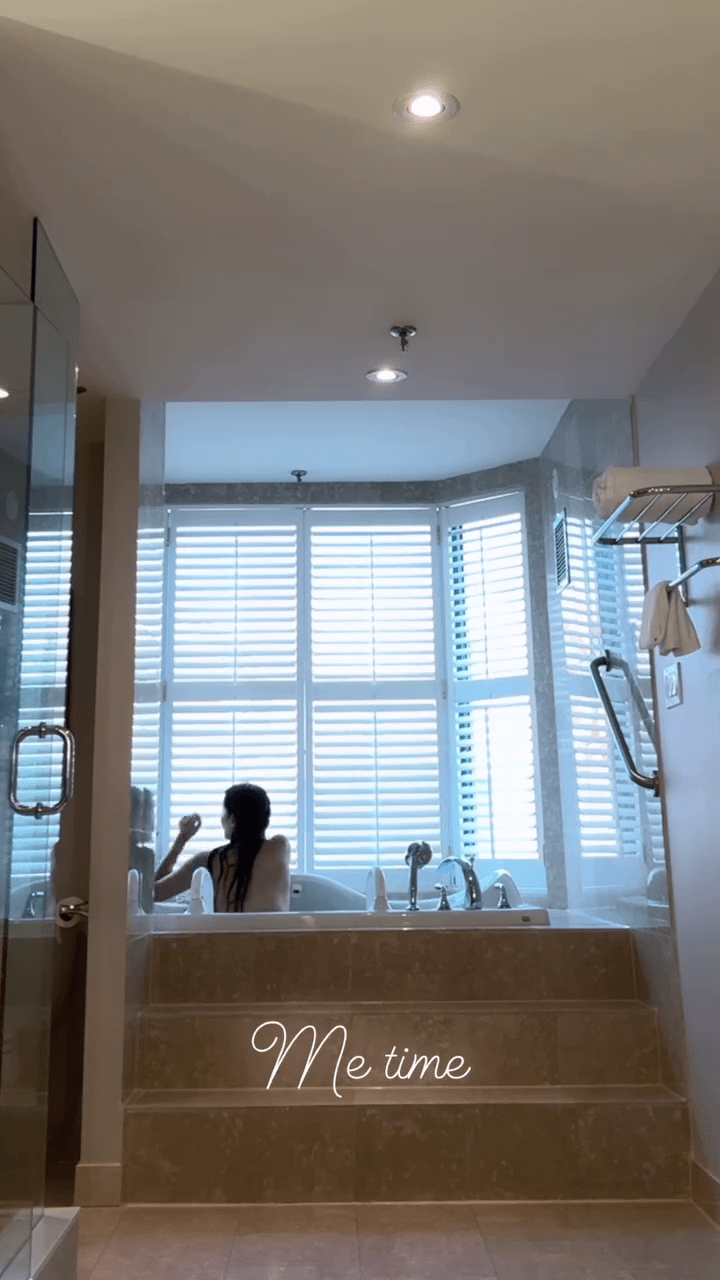 ▲周美欣到酒店出浴,大晒白滑玉背。