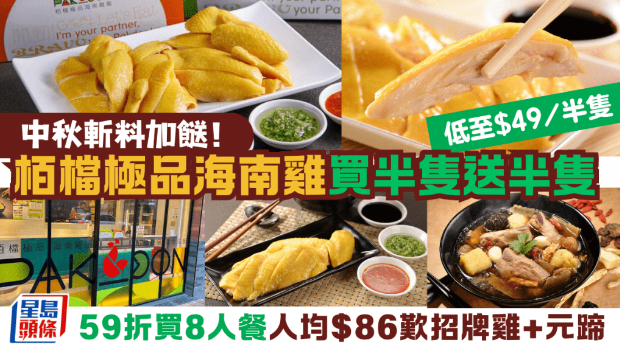 临近中秋,栢档极品海南鸡饭天后店会推出招牌去骨海南鸡买半只送半只优惠,折扣后半只低至$49(原价$196/组),并同步推出多款优惠美食,包括以59折买肉骨茶,优惠后$39/份(原价$66/份);59折买6至8人派对美食餐(优惠价$688/份,8人平均$86/位,原价$1288/份),有极品去骨海南鸡2只、卤水元蹄 、秘制卤烧猪颈肉、香煎手剁鱼香肉饼 、小食拼盘2份、时菜2份、无味精靓汤/罐装饮品/细肉骨茶8份等;食客亦可以75折购买$100现金券。