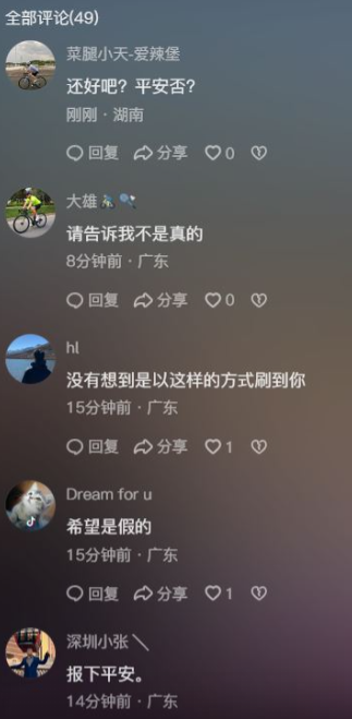 消息流出后,不少内地网民透过涌到其抖音最新片段留言,纷纷希望她报平安,“请告诉我不是真的”、“希望是假的”、“海莉子,报下平安”、“还在吗”,令人惋惜。