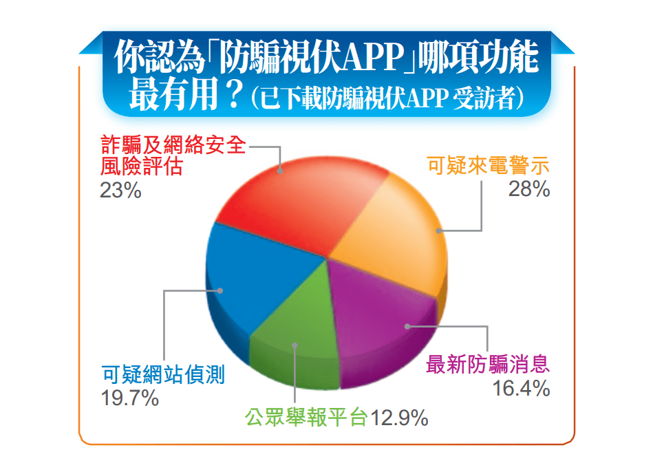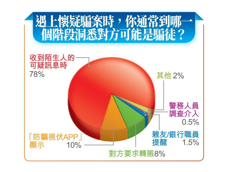 在骗徒水银泻地式攻击下,43%受访市民在过去一个月遇到怀疑骗案6次或以上,当中一成人更多达20次或以上。78%受访市民表示,当收到陌生人的可疑讯息时,已洞悉对方可能是骗徒;一成人指在使用警方“防骗视伏APP”后得悉;8%要到骗徒要求转账时才醒觉。
