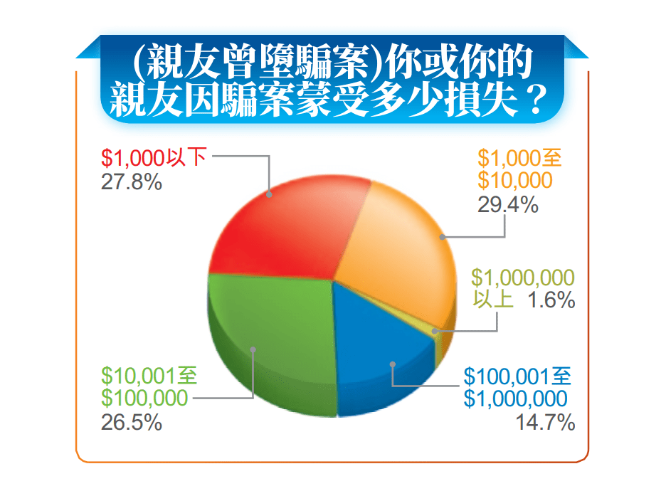 另外有32%受访市民表示,自己或亲友曾堕骗案,当中逾八成损失10万元(港币,下同)或以下,1.6%损失100万元以上。