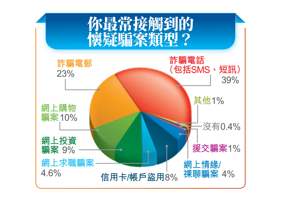 今次调查是以网上问卷形式于《星岛头条App》及《星岛头条》网站进行,总参与人数超过1万,反应相当踊跃。结果显示,有逾9成受访市民表示在过去一个月曾遇怀疑骗案;被问到“你最常接触到的怀疑骗案类型?”以诈骗电话最多,达39%;其次是诈骗电邮,占23%;之后是网上购物骗案,占10%。