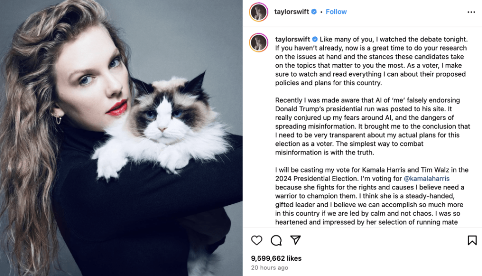 名人背书发挥重大影响的情况罕见,但Taylor Swift这位人气女歌手在社交媒体上坐拥超过1亿粉丝,其中1000万人对她支持哈里斯的帖文点赞。