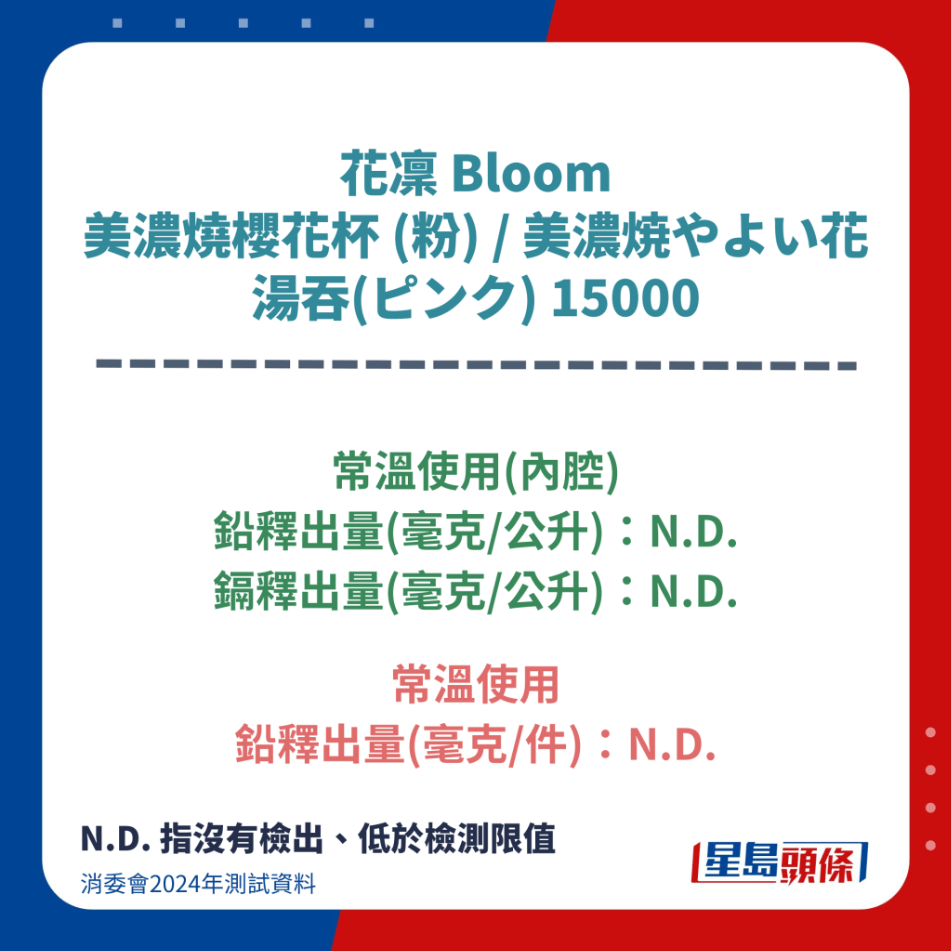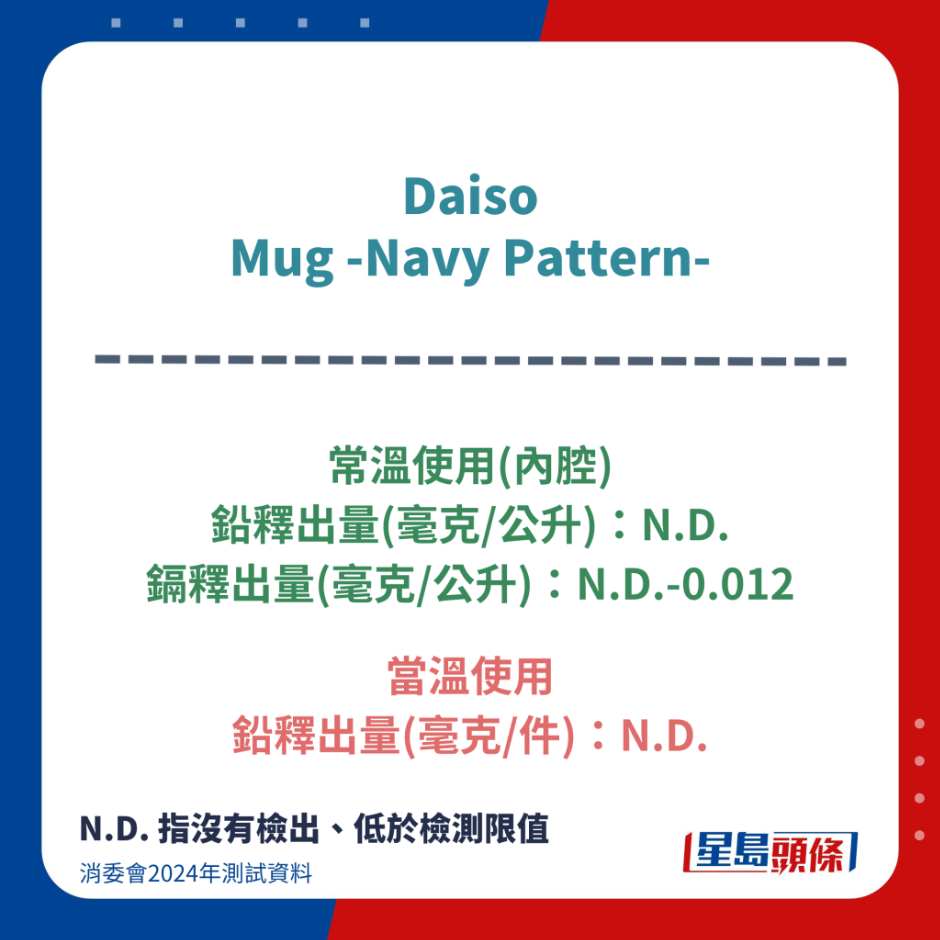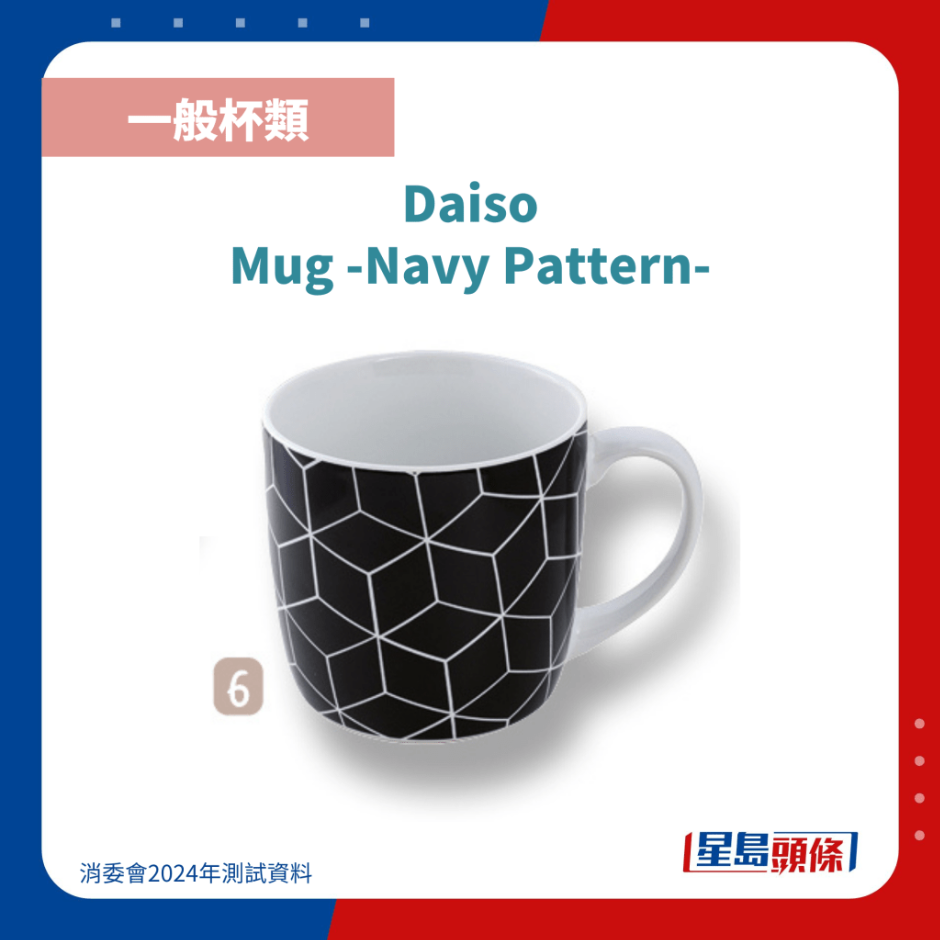 在镉的检测中,Daiso Mug - Navy Pattern-、Dunoon Fine Bone China Cosmos A Design by Caroline Dadd(P08H01)及小号四方杯Venus Porcelain(224-301)三款陶瓷杯的内腔部分有镉释出,检出量为每公升0.012毫克至0.060毫克,均低于标准容许限值(每公升0.25毫克)。