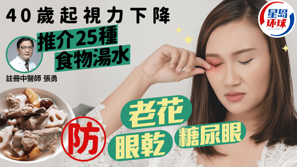 都市人机不离手,容易用眼过度,加上人到中年,约40岁起视力容易衰退,或经常出现眼矇、眼干、眼倦、眼痕、易生眼疮等问题。 血糖水平较高人士或糖尿病患者,更要小心糖尿眼并发症。 注册中医师张勇按以上各证型,推介25种护眼食物及汤水茶疗,预防眼疾。