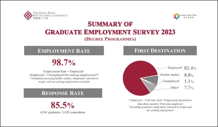 2023年,港理共有3628名本科毕业生参与了就业调查,占总毕业生数的85.5%。在被调查的理大毕业生中,就业率高达98.7%。