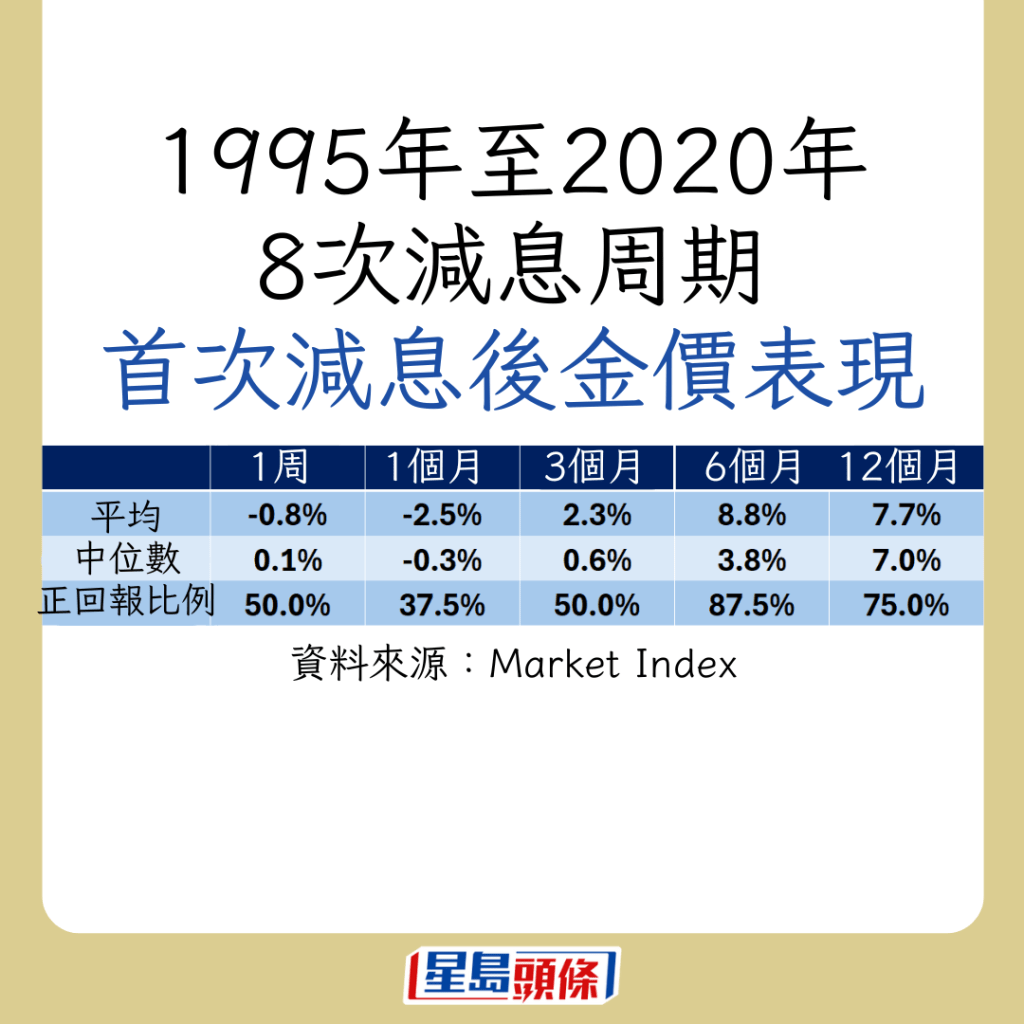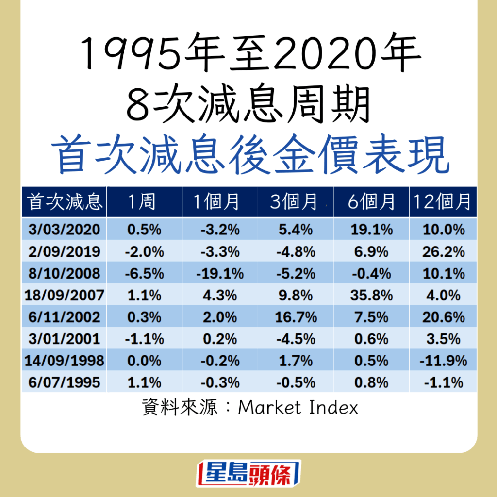 不过,在第一次减息的一周及一个月后,金价往往出现回调,分别平均下跌0.8%及2.5%。若看减息一个月,8次之中只有3次正回报。