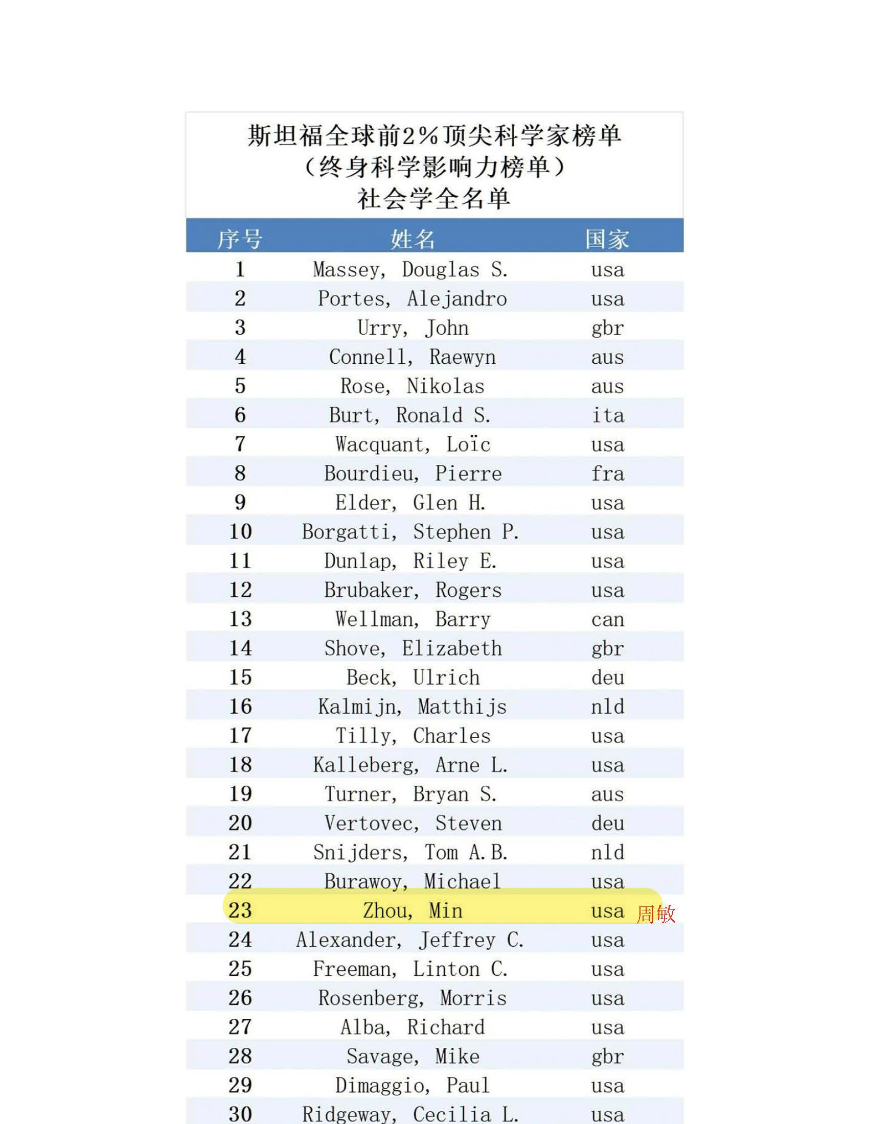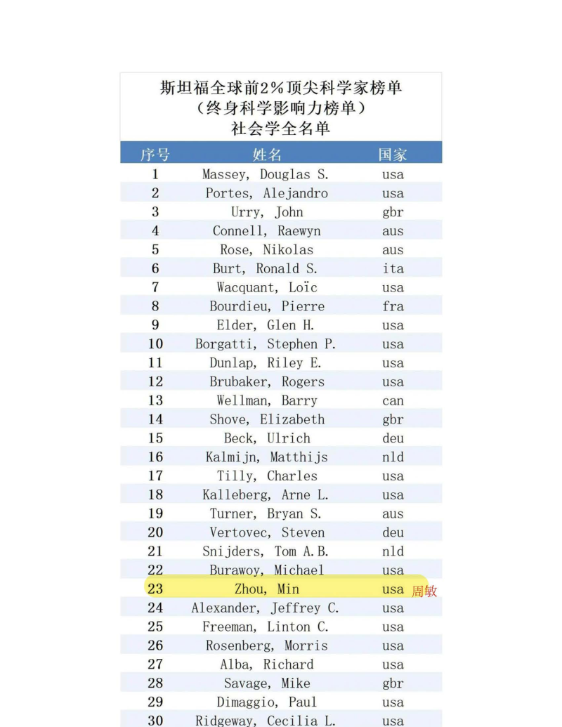 美籍华人社会学学者、美国洛杉矶加州大学(UCLA)周敏博士名列第23位,为华人社会学家的榜首。