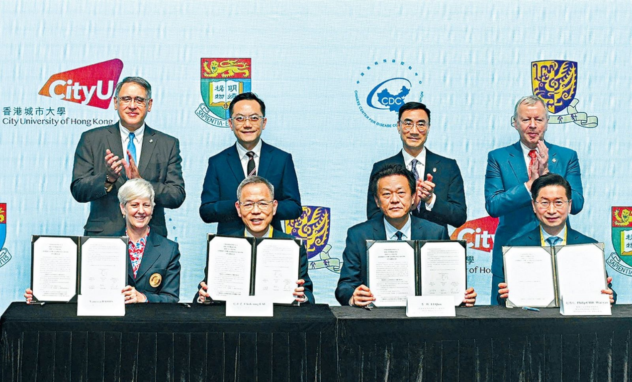 ▲为加强大湾区监察和应对传染病的能力,中国疾病预防控制中心副主任李群(前排右二)、香港大学医学院院长刘泽星教授(前排左二)、香港中文大学医学院院长赵伟仁教授(前排右一)和香港城市大学赛马会动物医学及生命科学院院长Vanessa Barrs教授(前排左一)签署合作谅解备忘录。签署仪式由马会主席利子厚(后排右二)、马会董事、公益慈善研究院主席黄嘉纯(后排左一)、马会行政总裁、公益慈善研究院董事应家柏(后排右一)和香港特区政府卫生署署长林文健医生(后排左二)见证。