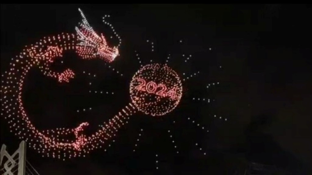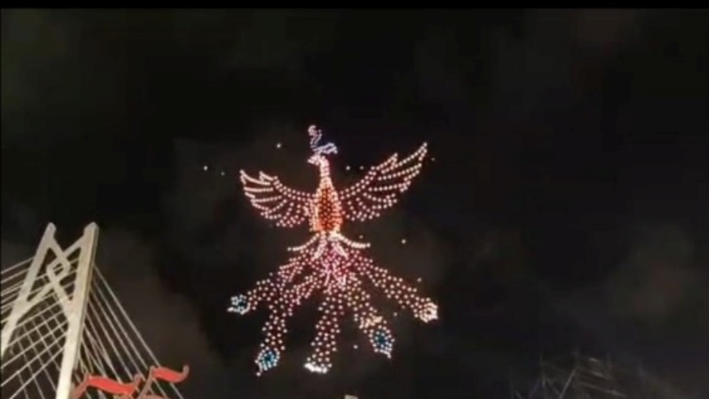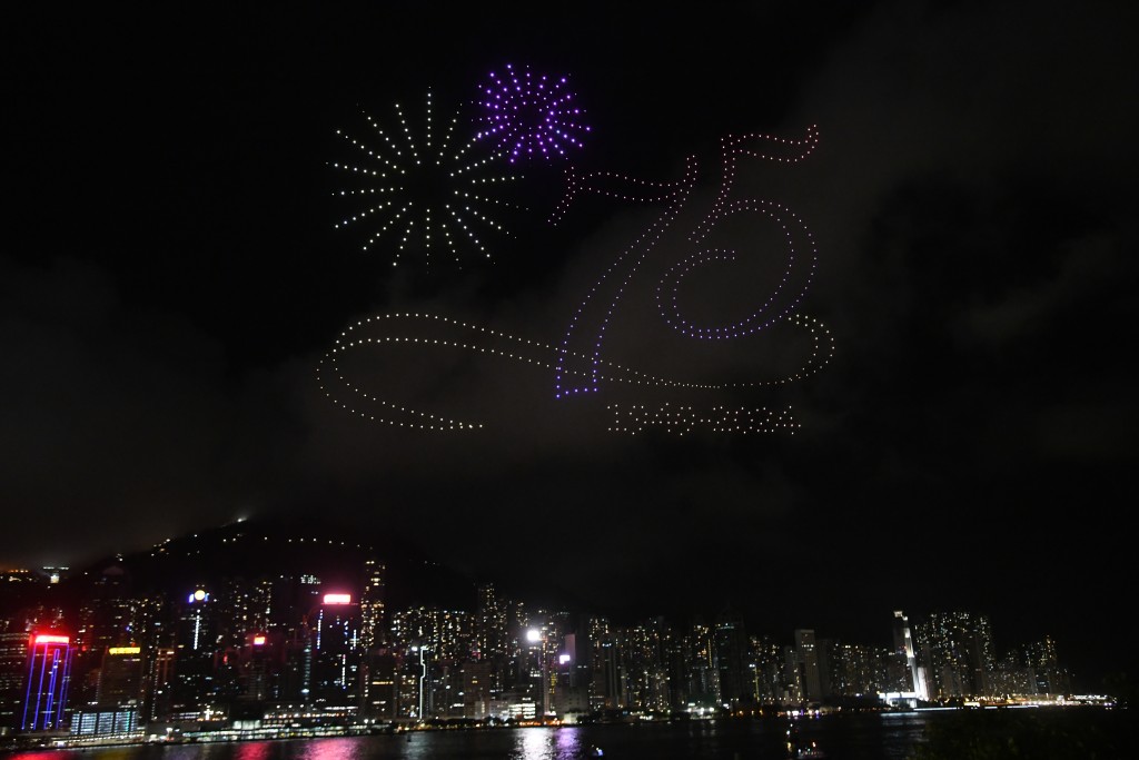 ▲有2000多架无人机在空中组成国、75、凤凰等图案。 何健勇摄