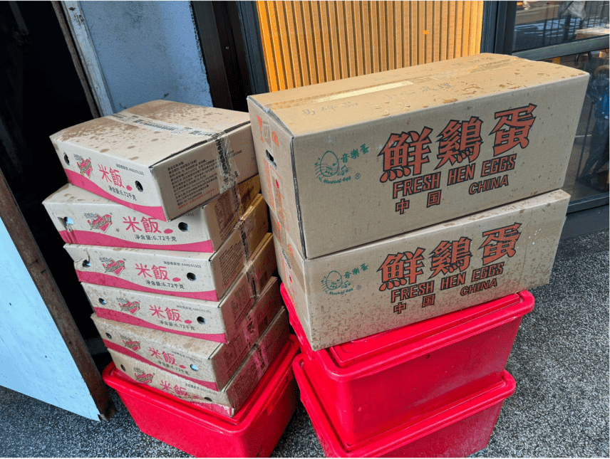 ▲有网民指发现本地某餐饮集团的连锁餐厅门外,摆放了6大箱内地产的预制米饭。