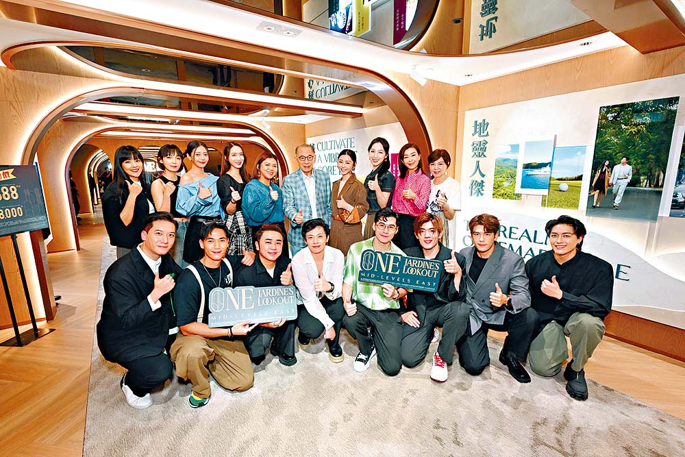 ▲英皇集团主席杨受成(后排右五)及英皇娱乐集团行政总裁许佩斯(后排右一)率一众英皇娱乐艺人参观公司楼盘。