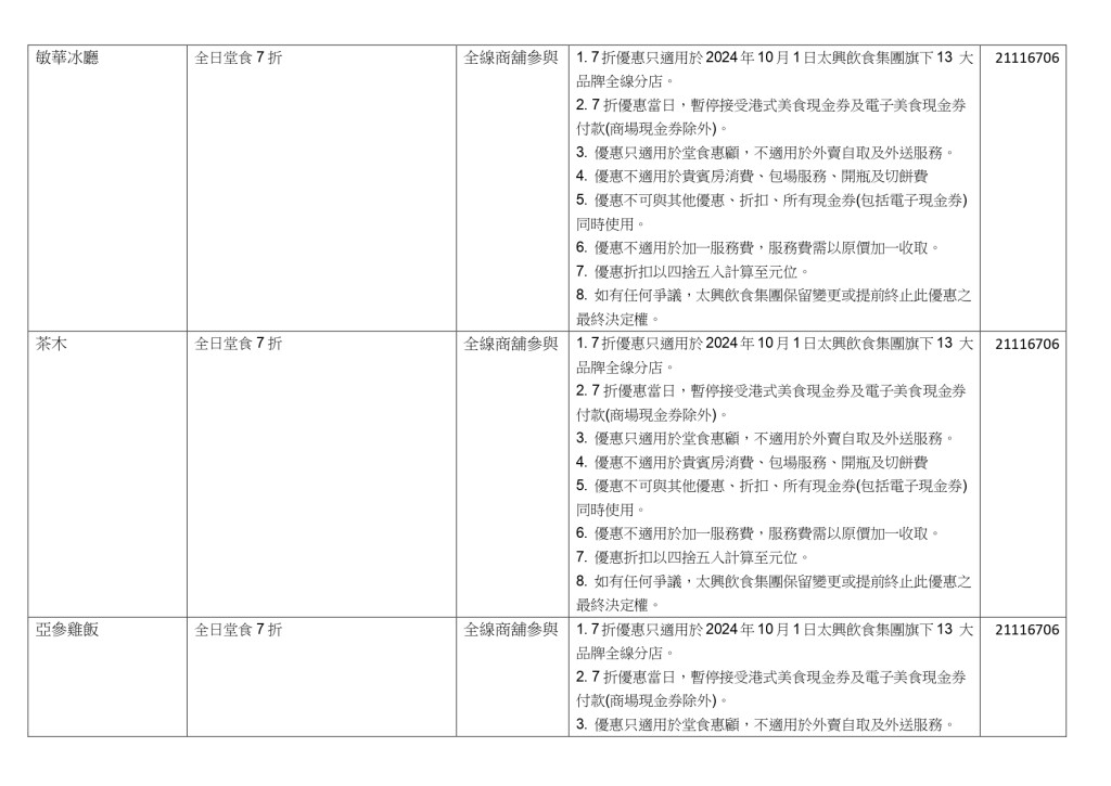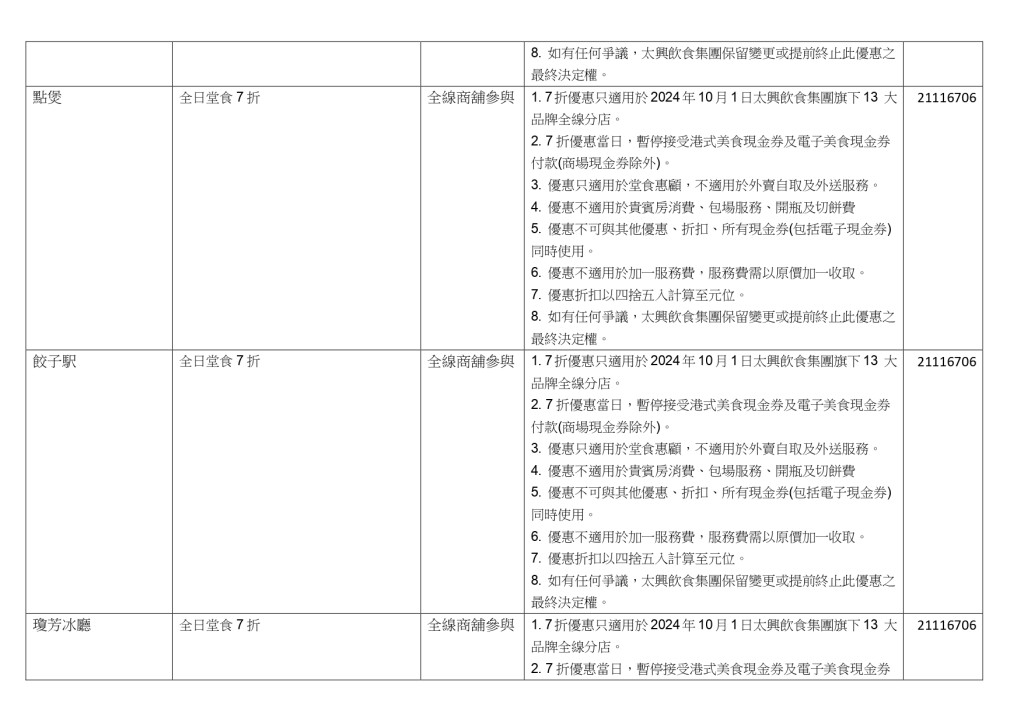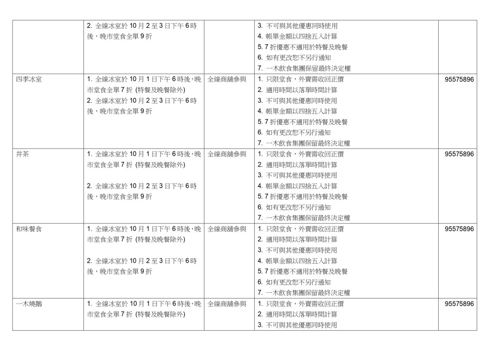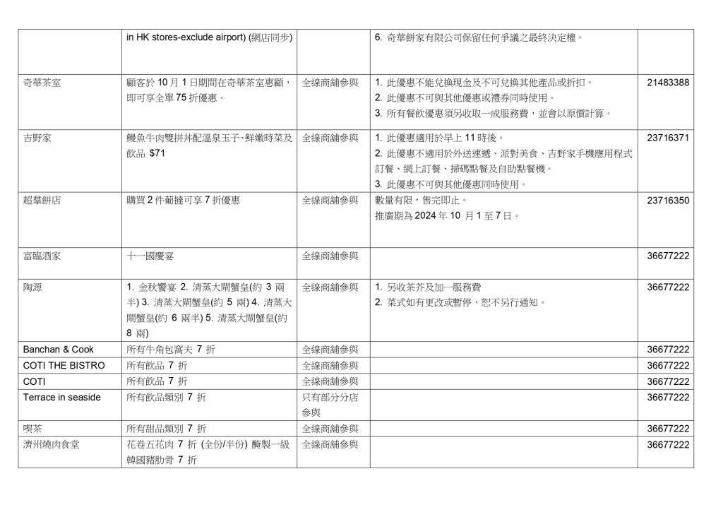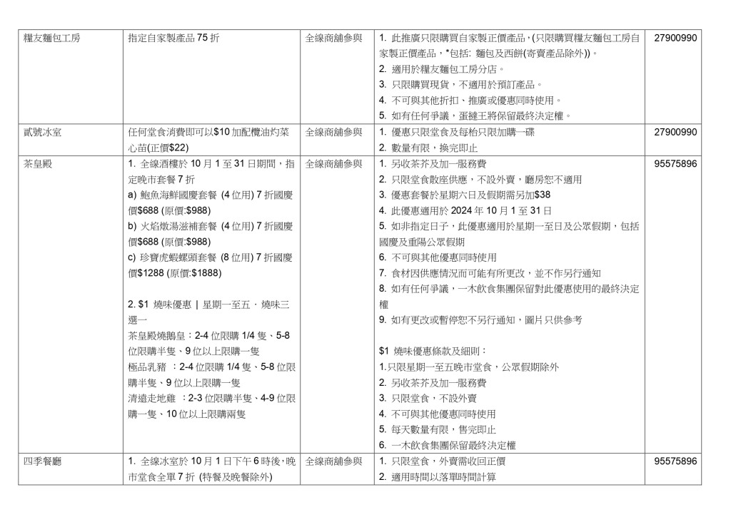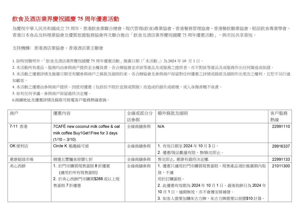 今年是中华人民共和国成立75周年,自由党立法会议员张宇人今日(27日)联同全港饮食界各团体推出国庆折扣优惠活动,今年有3600家餐厅参加。 其其中多家餐厅如太兴、敏华冰厅等餐厅均推出堂食七折优惠; 7-11在10月1至3日期间厚椰乳咖啡或燕麦奶咖啡全日买一送一。 美心集团全港部分分店在午晚市期间,鲜茄焗猪扒饭提供7折优惠,另外稻香、茶木,大家乐等亦有推出指定菜式或套餐七折优惠。