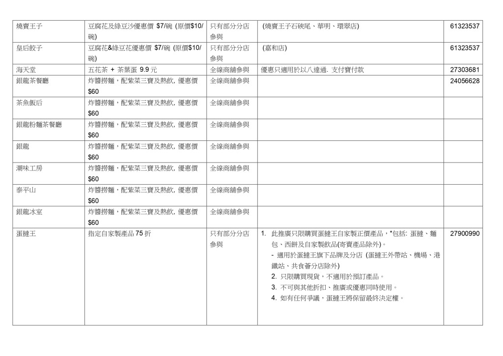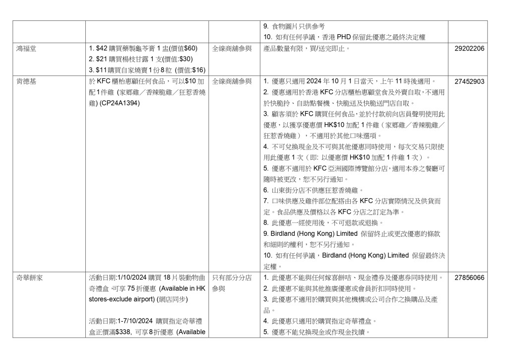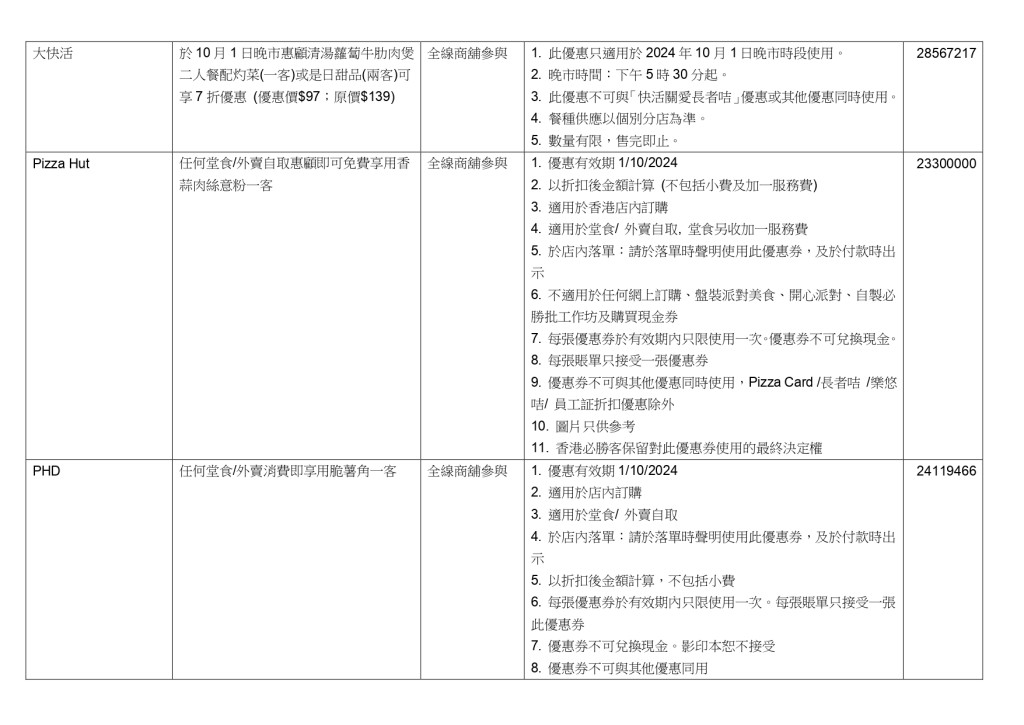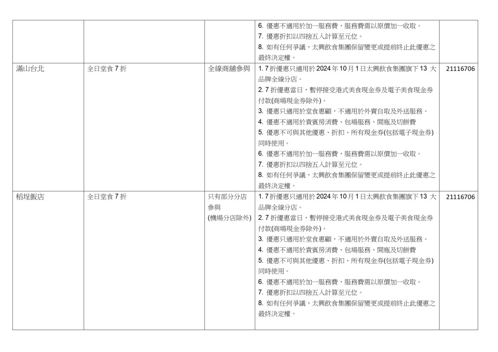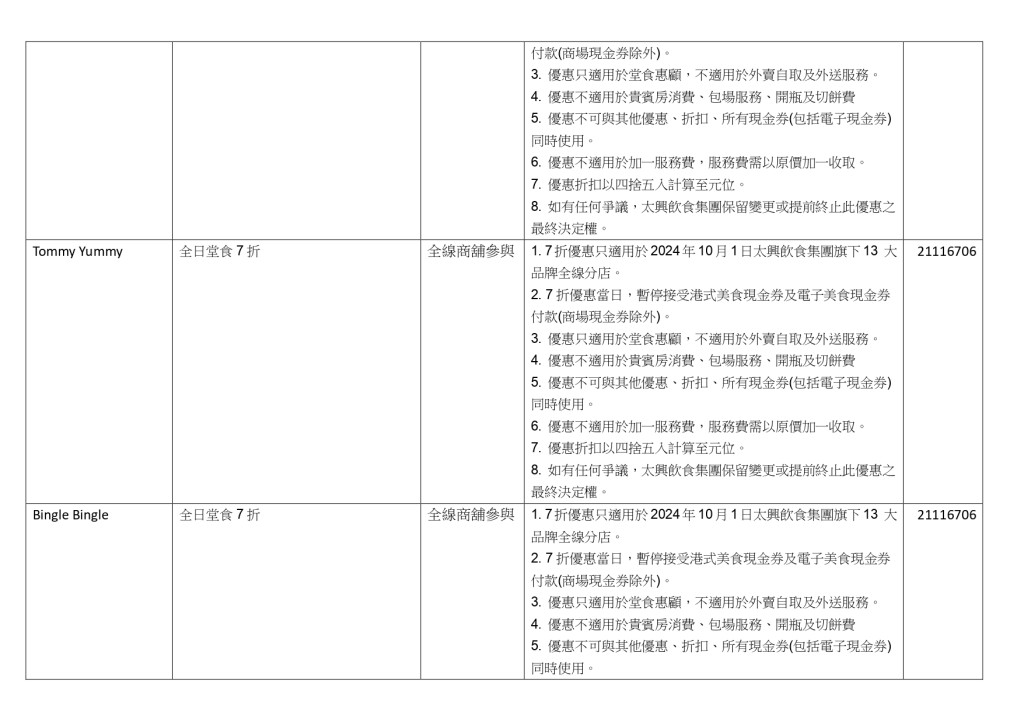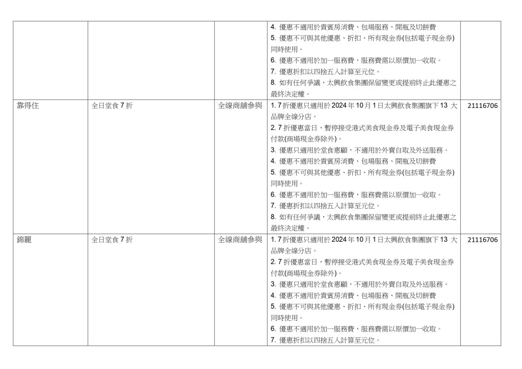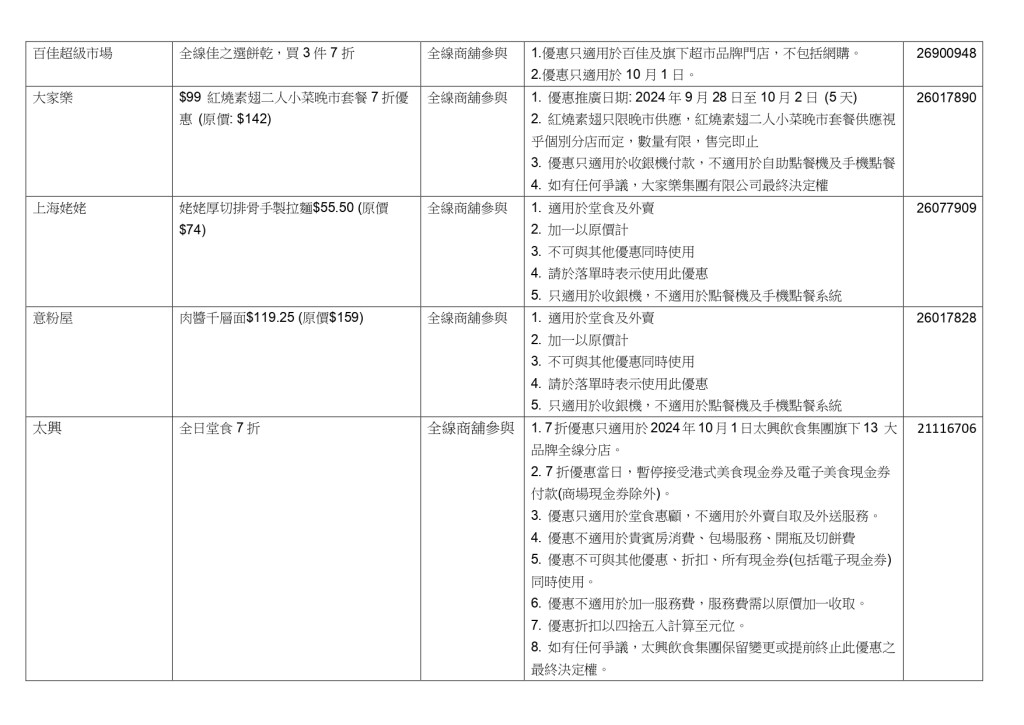 今年是中华人民共和国成立75周年,自由党立法会议员张宇人今日(27日)联同全港饮食界各团体推出国庆折扣优惠活动,今年有3600家餐厅参加。 其其中多家餐厅如太兴、敏华冰厅等餐厅均推出堂食七折优惠; 7-11在10月1至3日期间厚椰乳咖啡或燕麦奶咖啡全日买一送一。 美心集团全港部分分店在午晚市期间,鲜茄焗猪扒饭提供7折优惠,另外稻香、茶木,大家乐等亦有推出指定菜式或套餐七折优惠。