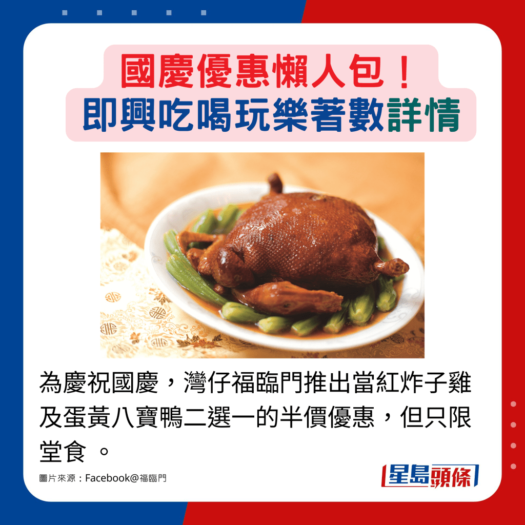 ▲为庆祝国庆,湾仔福临门推出当红炸子鸡及蛋黄八宝鸭二选一的半价优惠,但只限堂食 。