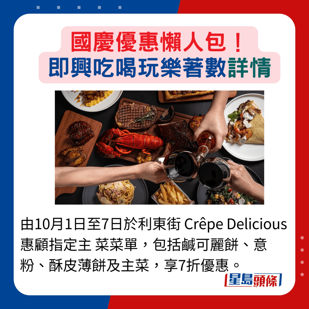 ▲由10月1日至7日于利东街 Crêpe Delicious惠顾指定主 菜菜单,包括咸可丽饼、意粉、酥皮薄饼及主菜,享7折优惠。