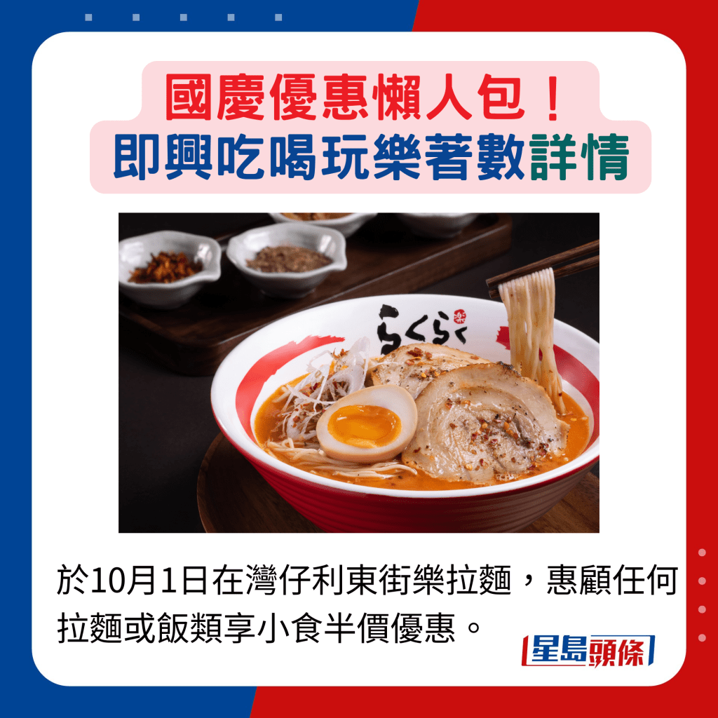 ▲于10月1日在湾仔利东街乐拉麵,惠顾任何拉面或饭类享小食半价优惠。