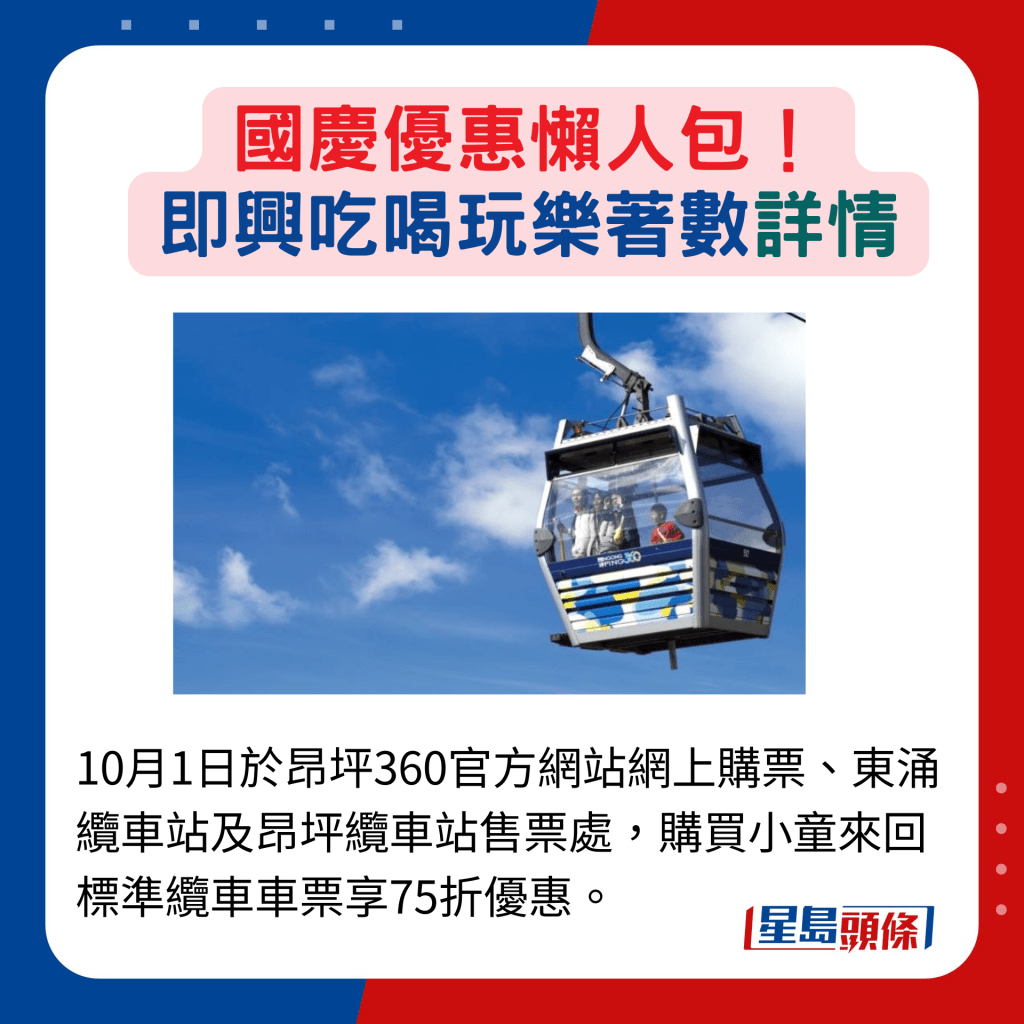 ▲10月1日于昂坪360官方网站网上购票、东涌缆车站及昂坪缆车站售票处,购买小童来回标准缆车车票享75折优惠。