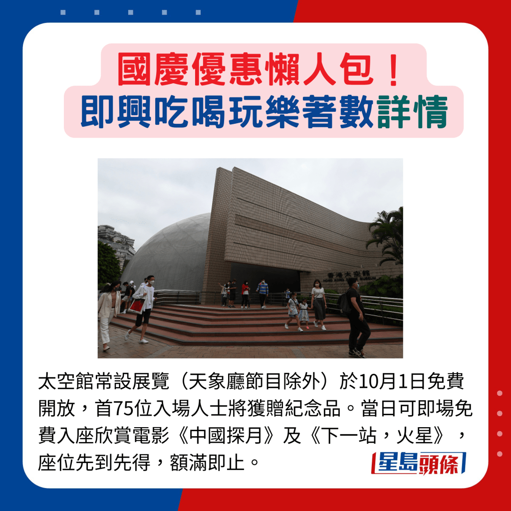 ▲太空馆常设展览(天象厅节目除外)于10月1日免费开放,首75位入场人士将获赠纪念品。当日可即场免费入座欣赏电影《中国探月》及《下一站,火星》,座位先到先得,额满即止。