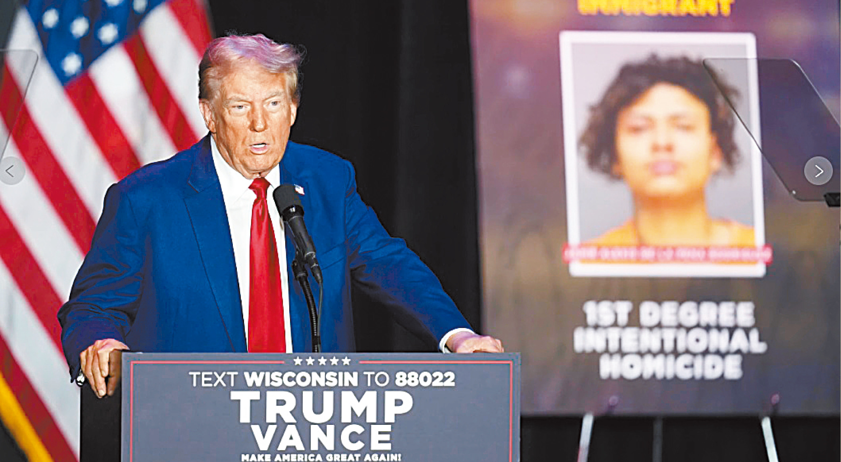 ▲特朗普出席演讲时,指责贺锦丽令国家的边界荡然无存,需为非法移民犯罪急增的现象负责。 美联社