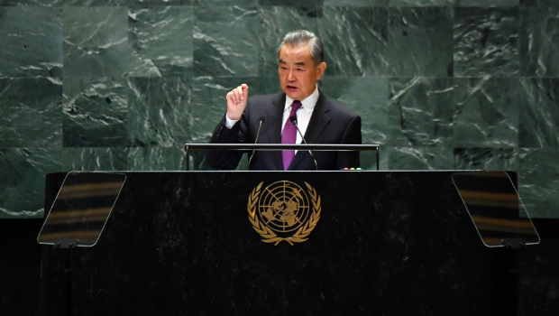 ▲外交部长王毅28日在纽约联合国总部发表演讲。新华社
